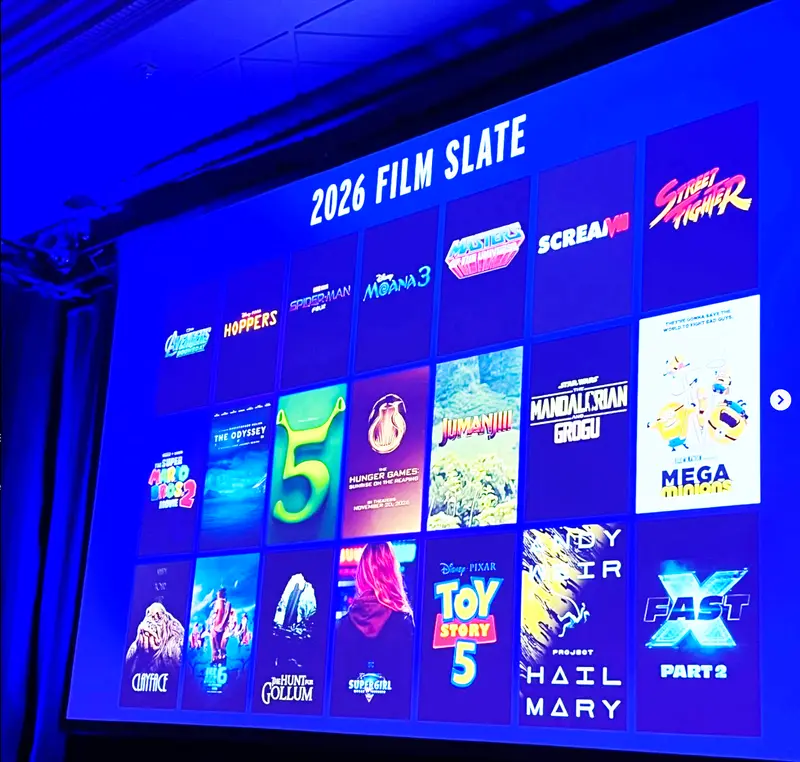 這是於CinemaCon主題演講中展示的一張大型圖片的一部分,該圖片展示了近二十部預計於2026年上映的最受矚目的電影。